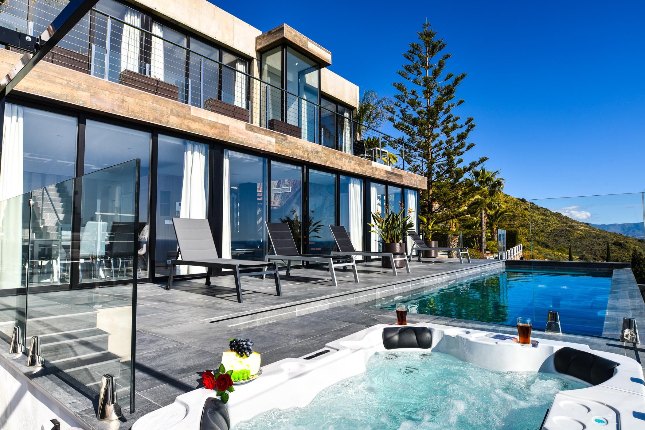 Distribuita su tre livelli, la villa dispone di un parcheggio per 2-3 auto, ampie camere da letto con vista mare e una zona giorno open space con cucina, accesso diretto alla piscina a sfioro, jacuzzi, barbecue e fontana. Situata nell'esclusiva urbanizzazione Alfa Mar, dista meno di 10 minuti dalla spiaggia, dalla città e dal campo da golf, ed è facilmente raggiungibile da Granada, dall'aeroporto di Malaga, da Nerja e dalla stazione sciistica della Sierra Nevada.